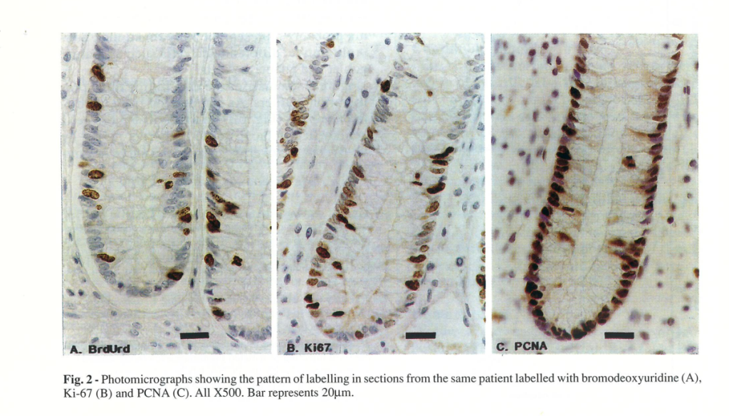 Samples of microscopically normal human sigmoid colon fixed in 70% ethanol from 15 patients who had received bromodeoxyuridine (BrdUrd) prior to surgery have been reanalysed using a combination of proliferation markers. The specimens have been immunostained for proliferating cell nuclear antigen (PCNA) and after microwave treatment, they have been stained for BrdUrd and Ki-67.