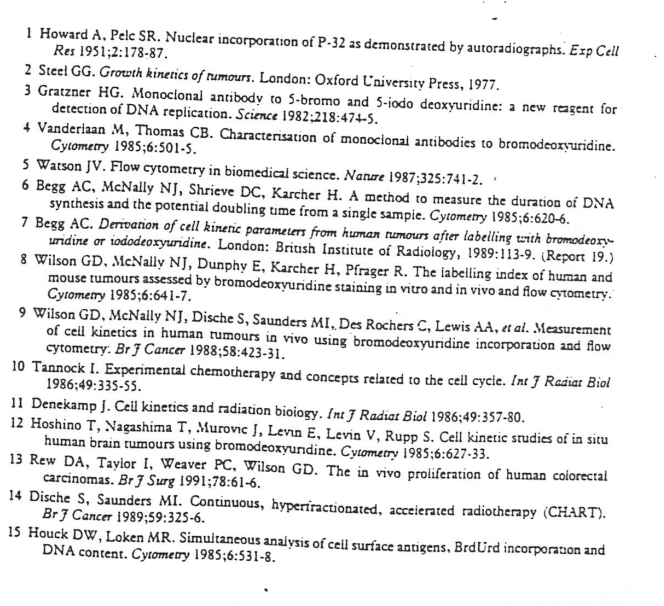Abnormal proliferation of cells is an important feature of many diseases, particularly malignancy. Knowledge of the proliferative characteristics, or cell kinetics, of tumours may help to unravel the disease process and to optimise the timing of treatment. Proliferating cells pass through a series of discrete phases in their life cycle. Howard and Pelc, responsible for the modern concept of the cell cycle, described five phases.¹ From the G1 (gap 1) phase cells enter either the G0 (resting) or S (DNA synthesis) phase. From the S phase they enter the G2 (gap 2) phase, from which they pass into the M (mitosis) phase and then back into G1. Chromosomes are duplicated during the S phase.