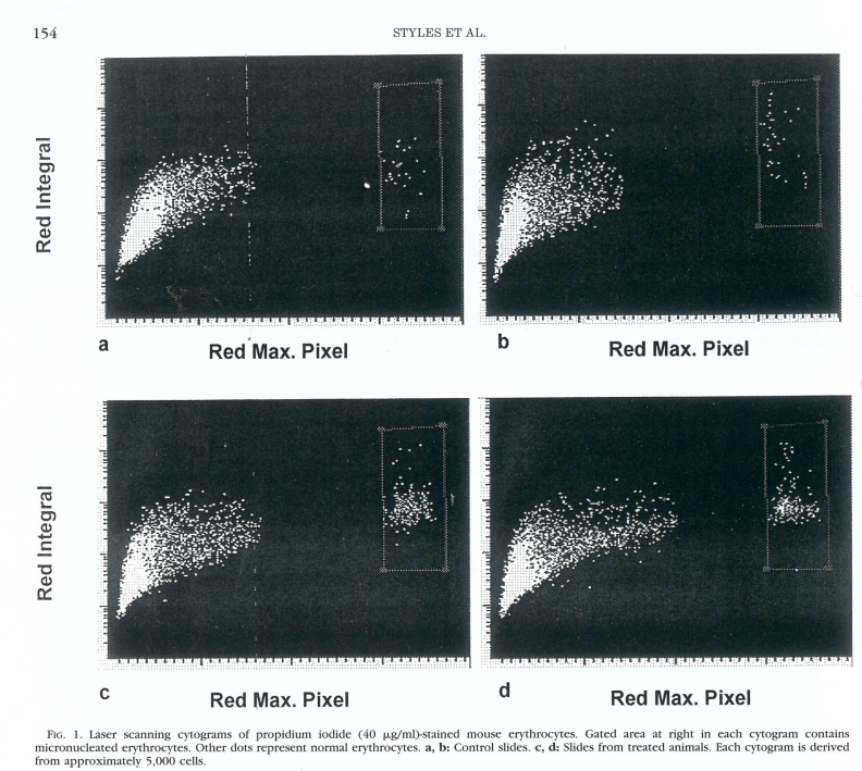 Materials and Methods: One hundred forty-four mice of various strains were dosed with combinations of carcinogens and antioxidants. Duplicate blood films were prepared 3 days later. One set of slides was stained with acridine orange, and the proportion of micronucleated erythrocytes was counted in 5,000 cells per slide. The duplicates were stained with propidium iodide (40 µg/ ml). Five thousand cells per sample were examined using a laser scanning cytometer. The proportion of micronucleated erythrocytes was measured.