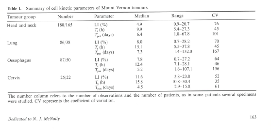 The study of human tumour cell proliferation using in vivo administration of bromodeoxyuridine (BrdU) and flow cytometry (FCM) has been studied at the Gray Laboratory and Mount Vernon Hospital since 1985 (Begg et al, 1985; Wilson et al, 1985, 1988; McNally & (Begg et al, 1983; Wison 1991 Wilson & Wilson, 1989; McNally, 1989; Wilson, 1991; Wilson & McNally, 1992). During this period over 570 patients have been studied, with a variety of solid neoplasms including head and neck, oesophagus, lung, rectal, cervix, uterus, testicular and breast carcinomas and sarcomas, lymphomas and melanomas. These studies have shed new light on the proliferative characteristics of human tumours both by the numbers that have been studied in vivo and the cell kinetic parameters that can be generated. Until this technique was developed, studies on human tumours were restricted mainly to in vitro investigations in which only the labelling index (LI) could be assessed. The aim of these studies is to provide new biological information and to apply the measurements as a predictive test for therapy.
