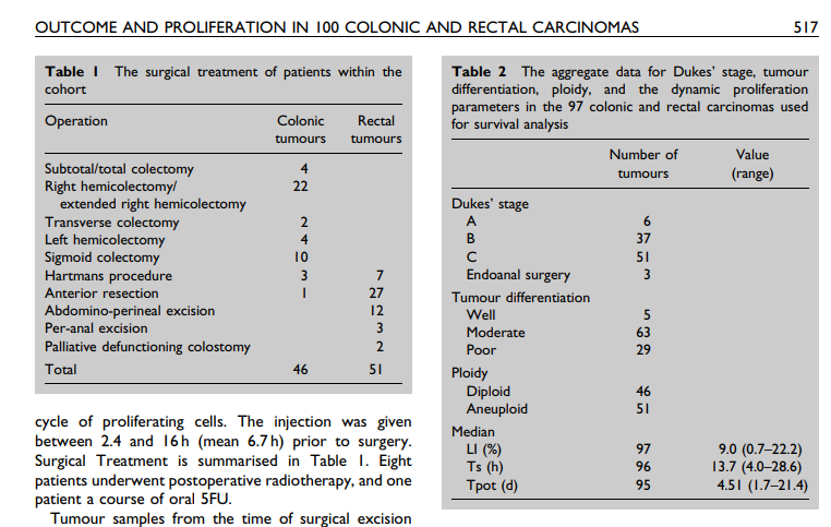 Aim: In vivo labelling of human colonic and rectal tumours with bromodeoxyuridine (BrdUrd) and analysis by flow cytometry (FCM) allows the labelling index (LI), S phase duration (Ts) and the potential doubling time (Tpot) of the tumour to be estimated in vivo.