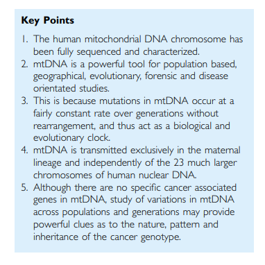 Mitochondrial DNA is a small, well characterized chromosome which is transmitted across the generations in the maternal lineage, independently of nuclear DNA. mtDNA acts in effect as a robust, species specific biological clock and tracer which can be used to follow the evolution and spread by geographic migration of populations from their origins. Mutations in mtDNA cause specific maternally hereditable diseases, and can be used for forensic purposes. They are not specifically implicated in neoplasia, but they may provide clues as to the nature and origins of cancer susceptibility in various populations.