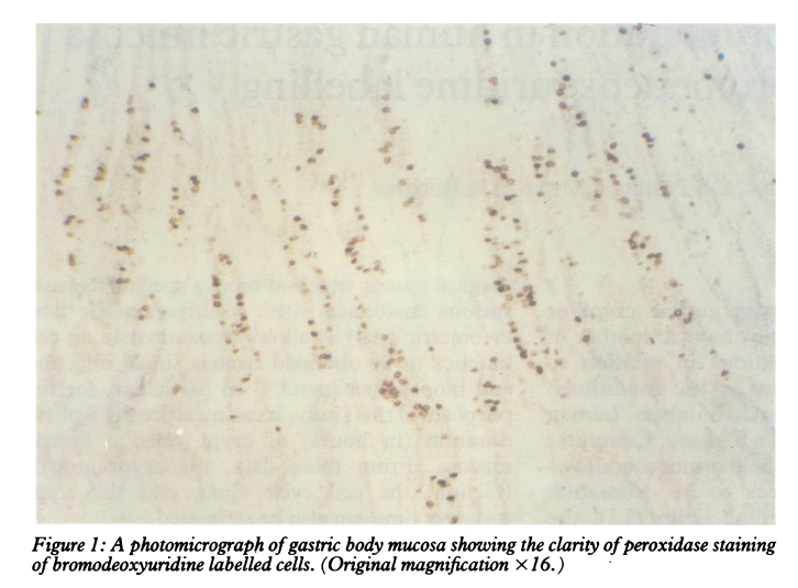 Studies to measure human gastric crypt or gland cell proliferation may have a number of practical clinical applications in relation to both benign and malignant gastric conditions. Bromodeoxyuridine (BrdUrd) labels human gastric mucosal cells in the S phase. Computer aided data analysis of labelled mucosa allows static proliferative indices to be estimated, including the crypt labelling index (LI), the peak labelling position, the distribution of labelled cells and indirectly the crypt growth fraction.