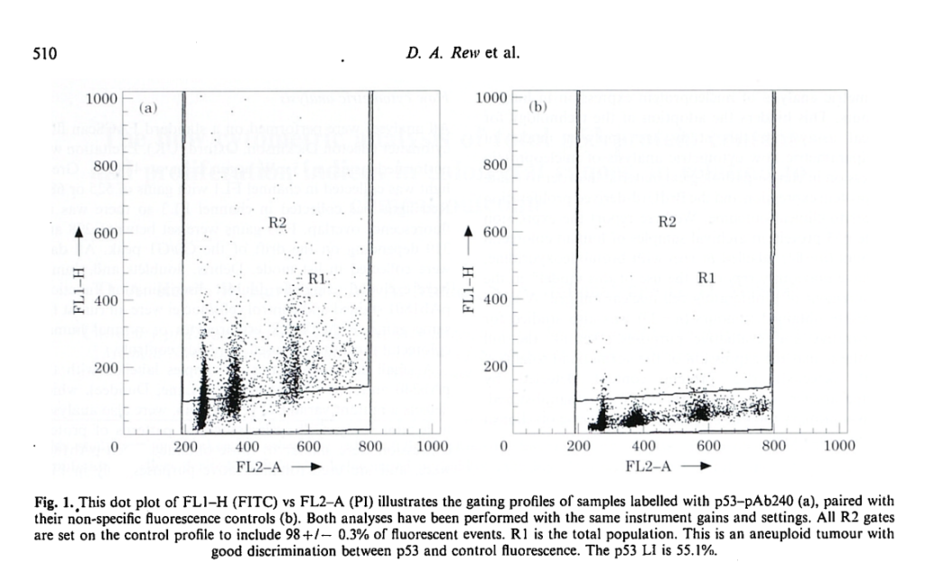 This study was undertaken to assess the value of flow cytometric measurements of total p53 protein content and proliferation indices derived from in vivo halogenated pyrimidine labelling. Two series of colorectal cancer specimens were studied for which clinical outcome data were recorded. A series of 84 archival, ethanol-fixed, bromodeoxyuridine (BrdUrd) labelled colorectal tumours were analysed by flow cytometry for their total and cell cycle phase p53 protein content using the pAbl801 monoclonal antibody. A second series of 33 freshly obtained tumours was used for assay evaluation and for comparison with the archival material, hi the archival series (n=84), the median p53-pAb1801 LI was 81.9"/,, (range: !1.1-99.8%). In only three tumours could significant amounts of p53 protein not be detected. The median phase specific p53-pAb1801 LI in G0/GI was 71.6%, in S was 95.5%, and in G2/M was 98.5%. In the series of fresh tumours (n = 33), the median p53-pAb1801 labelling index (LI) was 94.6% (range: 17.9-99.9%). Only two turnouts failed to express significant amounts of p53 protein. There was no significant difference in the generally high levels of p53 protein content between the fresh and archival series. Life-table analysis of the patients in tbe archival series failed to demonstrate a statistical difference in life expectancy in relation to Dukes' stage when tumours were stratified by the median total p53 labelling index. In this study, p53 content and proliferative indices measured by flow cytometry do not have independent predictive value over Dukes' grading in determining the outcome of colorectal cancer. Flow cytometry is confirmed as a practical tool for multi-parametric and cell cycle analysis of oncoprotein expression in human tumour biopsies.