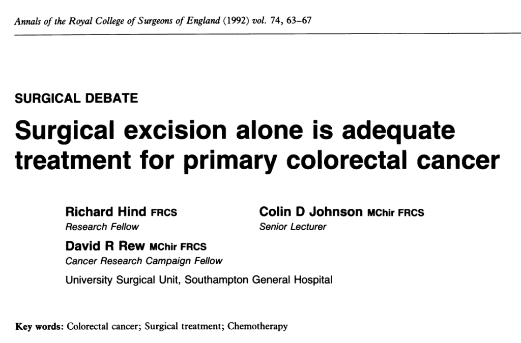 This debate examines the arguments for and against the proposal that surgical excision alone is adequate treatment for primary colorectal cancer. The arguments in favour are that the results from curative surgery are excelient and that despite many trials of adjuvant chemotherapy, radiotherapy and immunotherapy, the proposed benefits remain unproven. Recent improvements in surgical technique, particularly for dissection of rectal tumours, have shown the way towards further improvement using surgery alone, and it is clear from a national survey that technical factors related to individual surgeons play a large part in determining recurrence rates. With optimum primary treatment, surgical excision alone is indeed adequate therapy. The arguments against this motion are that although a considerable number of patients do survive with surgery, the 5-year survival rate is poor when there is extensive local invasion or lymphatic metastases. Surgery starts therapy by reducing the tumour load, but other modalities are required to destroy the celis which might subsequently develop into metastases. Trial results with adjuvant therapy are encouraging, although many contain too few patients. We cannot be content with the results of treatment of Dukes' Stage B and C tumours; more trials are needed to determine the best treatment for these patients.