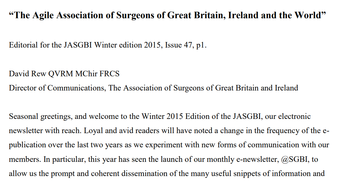 The Agile Association of Surgeons of Great Britain, Ireland and the World. Editorial for the JASGBI Winter edition 2015, Issue 47 - 15 Downloads