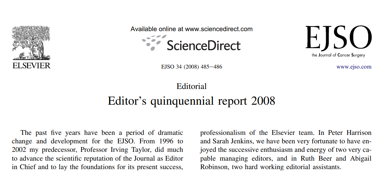 The past five years have been a period of dramatic change and development for the EJSO. From 1996 to 2002 my predecessor, Professor Irving Taylor, did much to advance the scientific reputation of the Journal as Editor in Chief and to lay the foundations for its present success, and we are delighted to report that Irving has returned to the EJSO as Chairman of the Board in 2008 in succession to Professor Niall O’Higgins. Niall’s light hand at the helm and genial oversight has allowed us to follow a bold course of modernisation, while balancing the various needs and perspectives of the two owners, BASO and ESSO, and Elsevier, who are also jointly our owners and publishers.