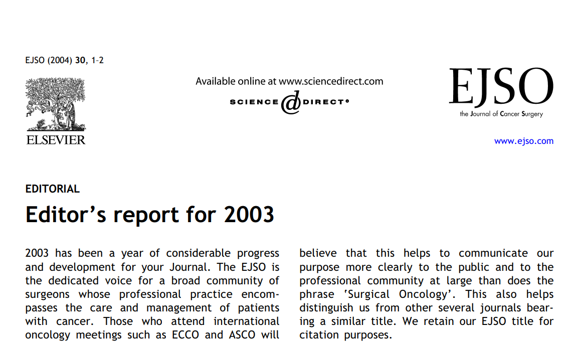 2003 has been a year of considerable progress and development for your Journal. The EJSO is the dedicated voice for a broad community of surgeons whose professional practice encompasses the care and management of patients with cancer. Those who attend international oncology meetings such as ECCO and ASCO will testify to the huge political, media and financial influence of the disciplines of medical and clinical oncology. We can all reflect ruefully on how little collective political power we can muster to influence our destinies and common interests as surgeons, and the need for a common vehicle to articulate and to advance our goals.