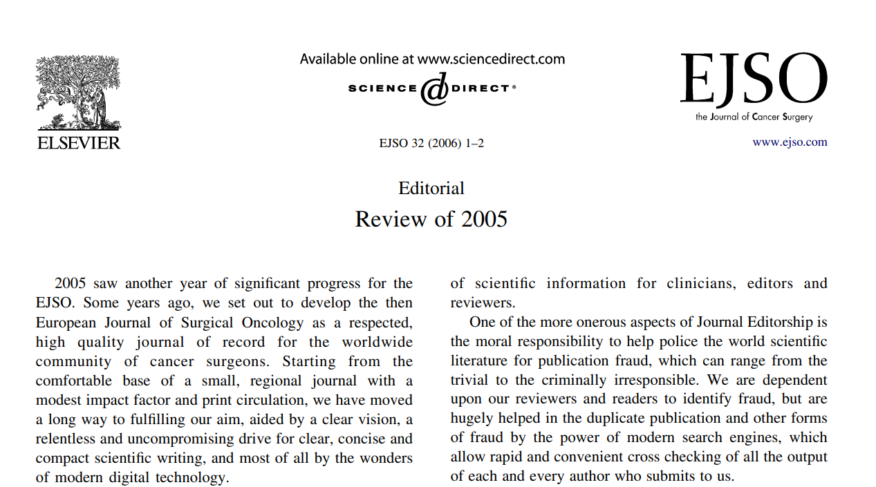 2005 saw another year of significant progress for the EJSO. Some years ago, we set out to develop the then European Journal of Surgical Oncology as a respected, high quality journal of record for the worldwide community of cancer surgeons. Starting from the comfortable base of a small, regional journal with a modest impact factor and print circulation, we have moved a long way to fulfilling our aim, aided by a clear vision, a relentless and uncompromising drive for clear, concise and compact scientific writing, and most of all by the wonders of modern digital technology.
