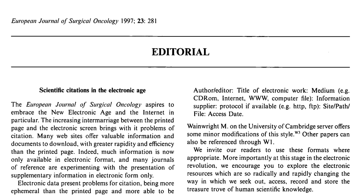 Scientific citations in the electronic age The European Journal of Surgical Ontology aspires to embrace the New Electronic Age and the lnternet in particular. The increasing intermarriage between the printed page and the electronic screen brings with it problems of citation. Many web sites offer valuable information and documents to download, with greater rapidity and efficiency than the printed page. Indeed, much information is now only available in electronic format, and many journals of reference are experimenting with the presentation of supplementary information in electronic form only.
