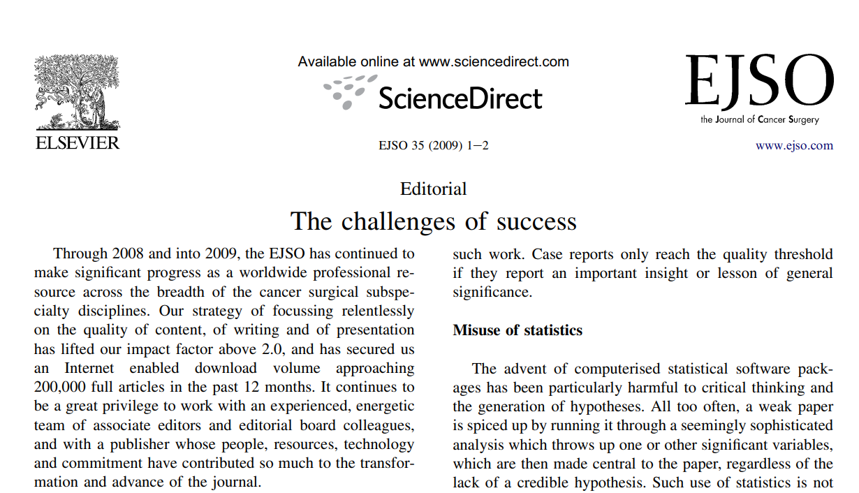 Through 2008 and into 2009, the EJSO has continued to make significant progress as a worldwide professional resource across the breadth of the cancer surgical subspecialty disciplines. Our strategy of focussing relentlessly on the quality of content, of writing and of presentation has lifted our impact factor above 2.0, and has secured us an Internet enabled download volume approaching 200,000 full articles in the past 12 months. It continues to be a great privilege to work with an experienced, energetic team of associate editors and editorial board colleagues, and with a publisher whose people, resources, technology and commitment have contributed so much to the transformation and advance of the journal.
