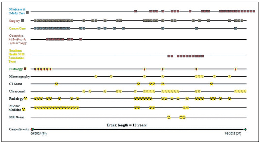 Figure 1: The UHS Lifelines graphical EPR interface, as an illustration of user focussed design in the paperless transition. This system is in live and real time daily use on an agile, continuously iterative test and development basis in selected clinical services at University Southampton. This particular record illustrates the documents generated in the course of treatment of a patient with bilateral breast cancer in June 2003. Clicking on any document opens the underlying document. All subject timelines (eg Surgery, Cancer Care) for which documents exist are displayed. It is apparent how quick and intuitive such a model can be in clinical use. Much can be learned about the pattern of health in any one patient from inspection of the patterns of documentation alone, before inspection of specific documents and reports.
